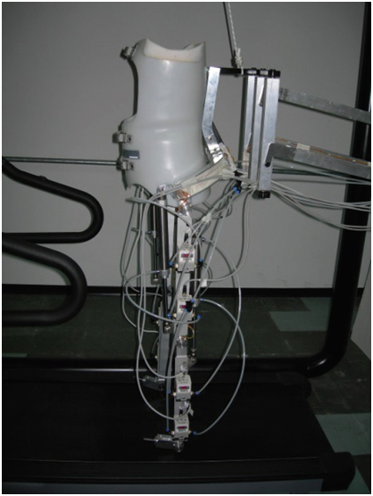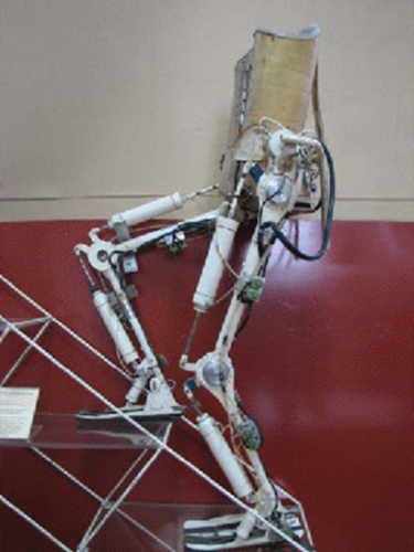 Проект М. Вукобратовича был более успешен: он стал предтечей не только ряда экзоскелетов медицинского назначения, но и современных антропоморфных ШР как класса. На рис. 4 представлена первая версия "силовой ноги", разработанная в 1971 г. Экзоскелет медицинского назначения с программно реализованной походкой, близкой к антропоморфной, был представлен в 1972 г. (рис. 5, 6), в настоящее время один экземпляр, переданный в рамках советско-югославского научного сотрудничества в Центральный институт травматологии и ортопедии (г. Москва), экспонируется в Политехническом музее г. Москвы (рис. 7, 8) [1, 2].