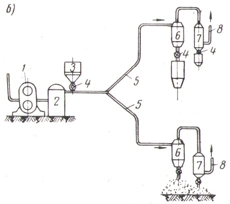 Смешанный поток материала с воздухом, который перемещается по нагнетательной части трубопровода, также может выводиться наружу свободно, а разделение компонентов происходит из-за резкого уменьшения скорости потока воздуха на выходе трубопровода. Подобный вид выброса материала из транспортного трубопровода может использоваться в тех ситуациях, когда сопутствующее такому процессу выгрузки запыление не будет оказывать негативных воздействий и последствий. Это упрощенный вид выброса используется обычно на закрытых складах или бункерах цемента. Для выравнивания давления в системе при использовании насосов поршневого типа применяется специальный ресивер (2), что позволяет избегать значительных скачков рабочего давления и пульсации транспортного потока корпускулярно-воздушной смеси. Это, в свою очередь, уменьшает износ и увеличивает ресурс магистрали и вспомогательного оборудования.