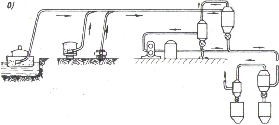 Одной из конструктивных схем установок комбинированного типа является использование центробежных вентиляторов. Это допустимо при условии возможности прохода через вентиляторы смеси частиц перемещаемого материала и воздуха. Такая возможность возникает при перемещении материалов с малой и сверхмалой крупностью (мелкодисперсные) и малой плотностью. При реализации такой схемы значительно упрощается вся пневмотранспортная установка. В её компоновке остаются всасывающие трубопроводы, которые соединяются только непосредственно во входном коллекторе вентилятора и, далее - нагнетательная магистраль, которая также может разделяться, в-зависимости от потребностей распределения материала.