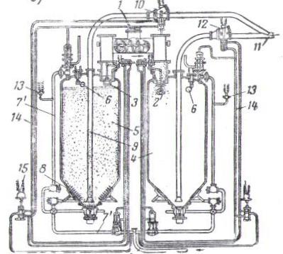 Контроль подачи воздуха осуществляется с помощью манометров (13), а управление системой камерных питателей происходит за счёт воздуха, поступающего по трубопроводам (14) с помощью золотниковых клапанов (15).